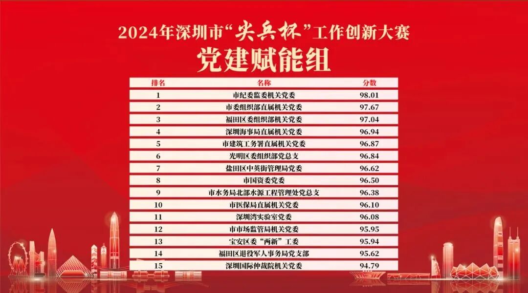 今年5月,2024年深圳市“尖兵杯”工作创新大赛正式启动。大赛以“党建引领转作风 改革创新促发展”为主题,展示各级党组织深入学习贯彻习近平新时代中国特色社会主义思想的亮点成效和全面提高党的建设质量的创新成果。大赛分文本申报、文本评审、专家辅导、综合评选、省赛准备五个阶段,重点围绕发展提质、正风增效、党建赋能等3个组别征集案例,并按照以上3个组别分别比赛。