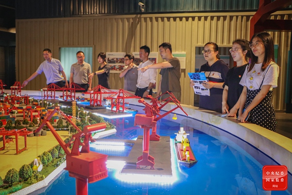 6月4日,宁波市北仑区纪委监委开展党史学习教育专题党日活动,组织纪检监察干部到中国港口博物馆参观“创新之路——现代港口知识陈列”展览,观看千年港口的演变史和中国现代港口建设成就,激发党员干部爱党爱国激情。图为区纪委监委党员干部观摩港口码头装吊展示沙盘。(宁波市北仑区纪委监委 陈荔 摄)